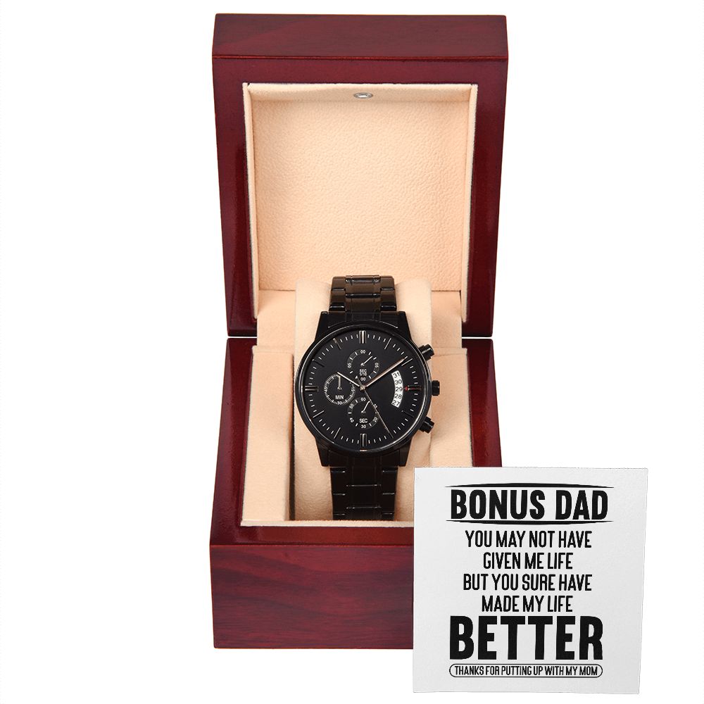 A handsome gift that can withstand constant use, this Black Chronograph Watch is perfect for all the special men in your life. A thoughtful present to your groomsmen, an anniversary memento, or a long-lasting keepsake for Father’s Day - it's a versatile piece sure to warm hearts and create smiles. Featuring a three-dial face, calendar function, and luxury pointer in a water-resistant and scratch-proof vessel.