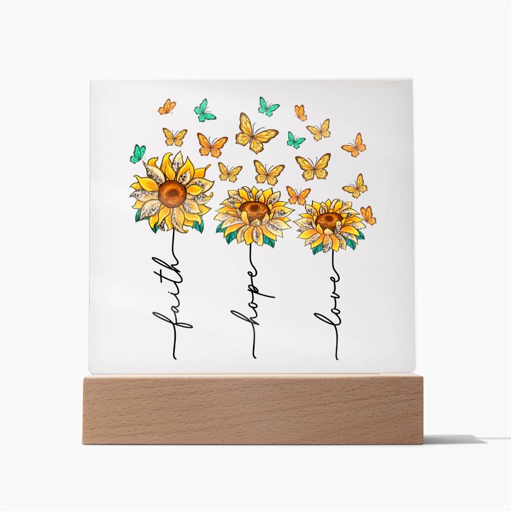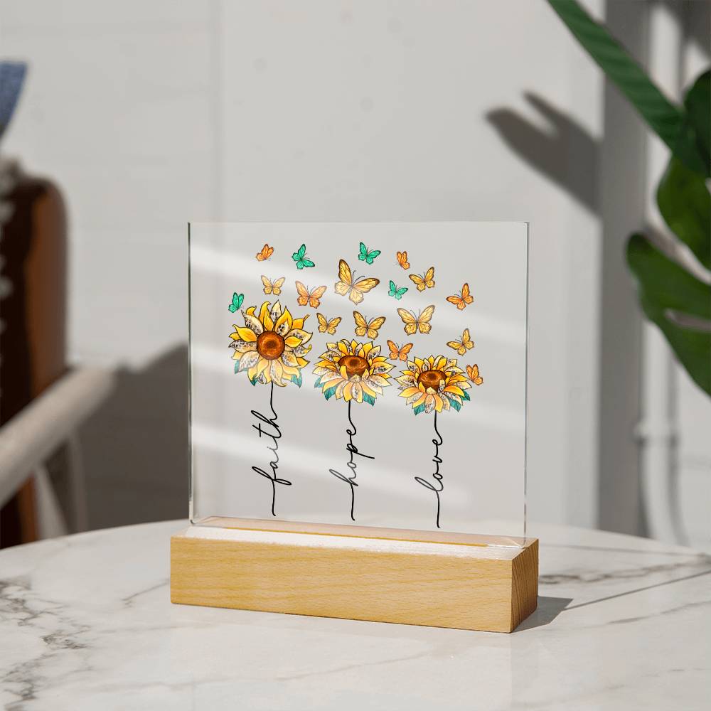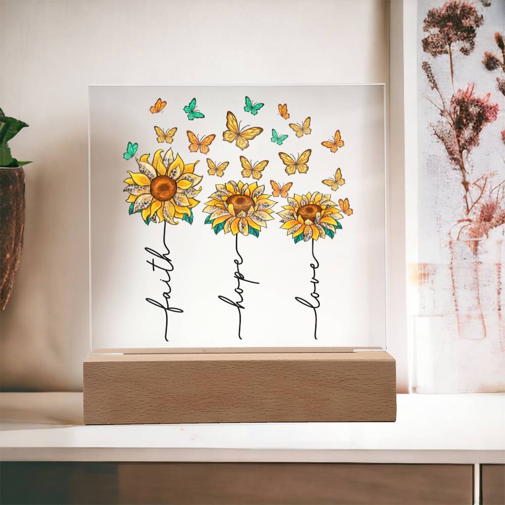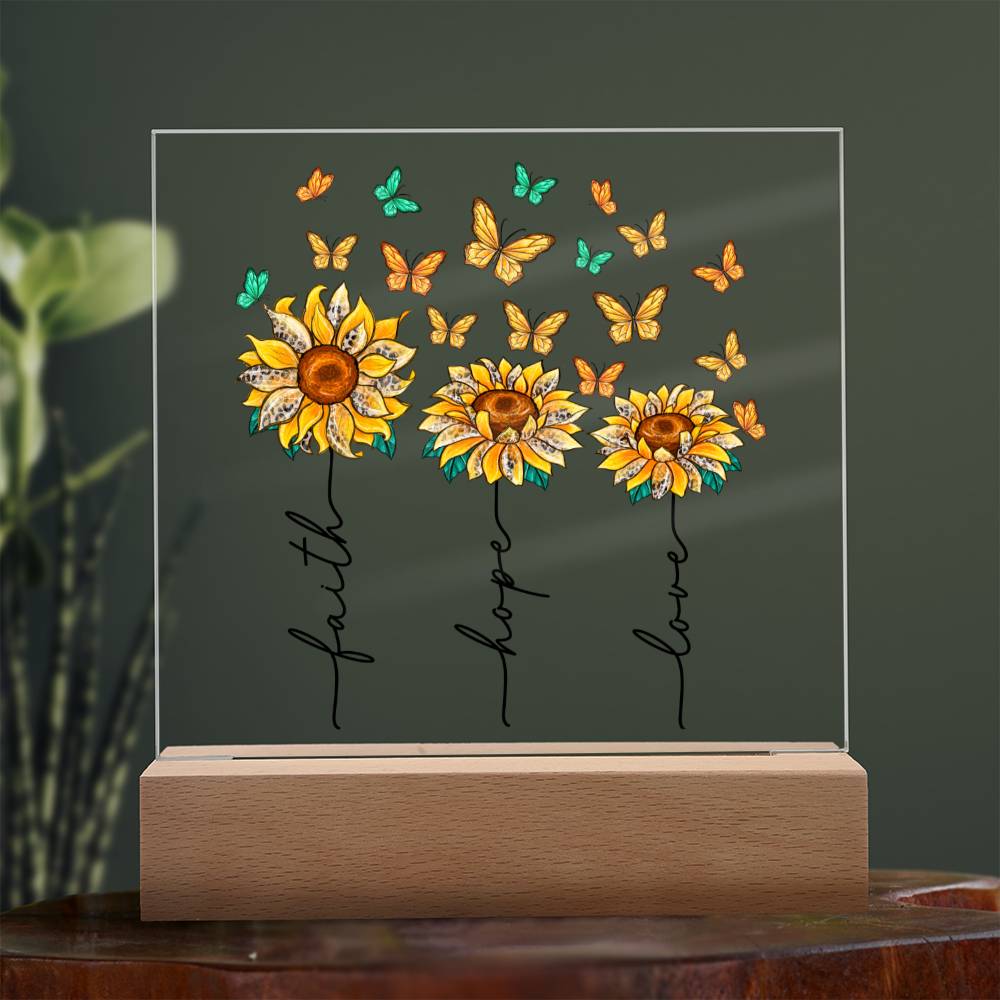 The Faith Hope Love acrylic plaque is a beautiful and meaningful decoration piece that can be displayed in any room of your home or office. It features the words "Faith, Hope, Love" in a stylish and elegant font, making it a great addition to any decor style. The plaque is made of high-quality acrylic, which gives it a sleek and modern look while also ensuring durability. Whether you're looking for a daily reminder of the importance of faith, hope, and love, or simply want to add a touch of inspiration to your space, this plaque is sure to make a statement.