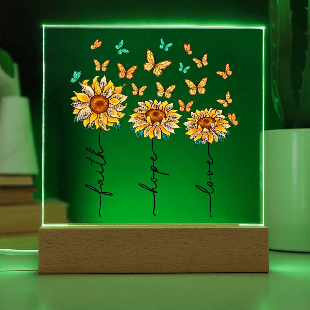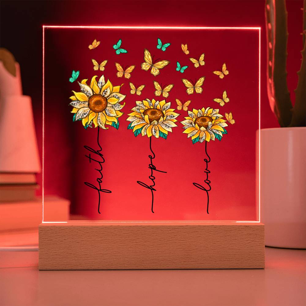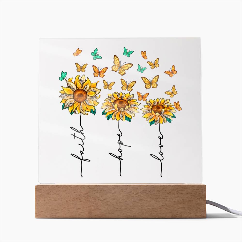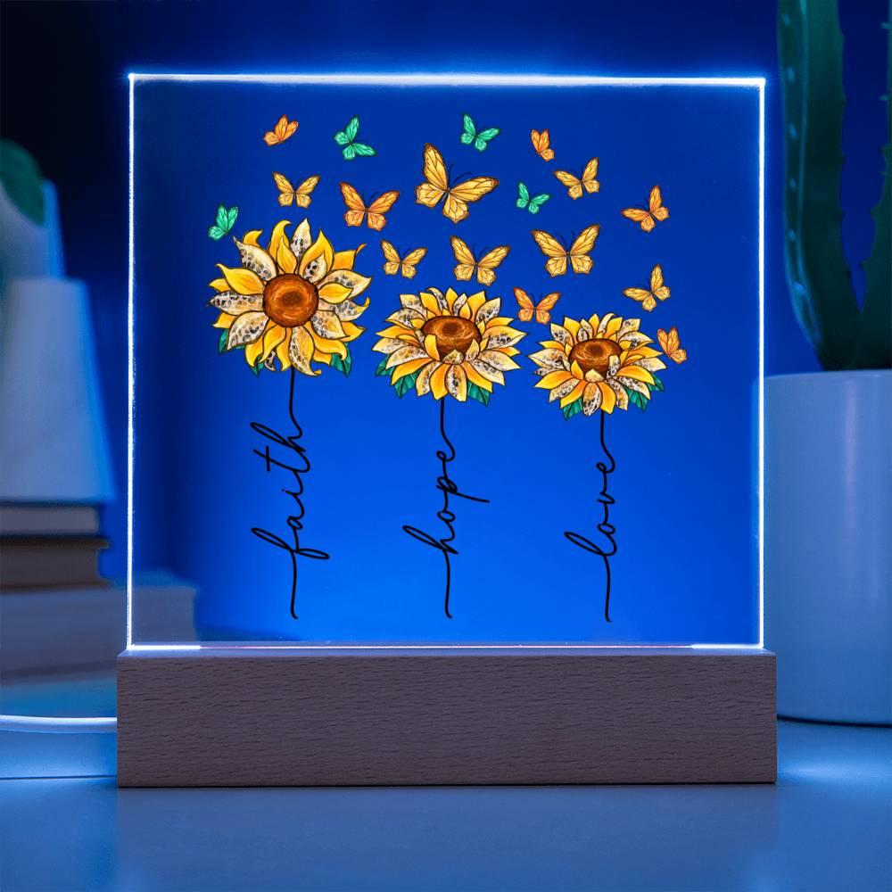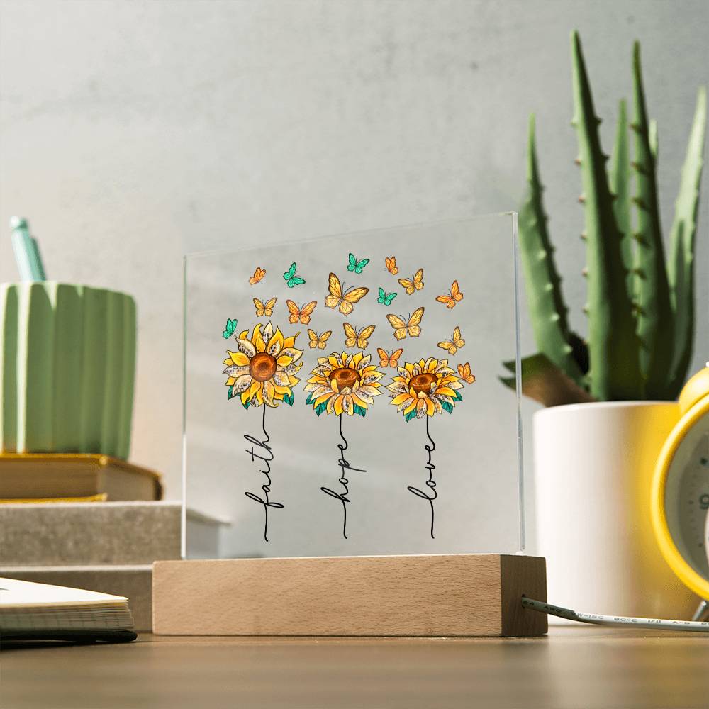 The Faith Hope Love acrylic plaque is a beautiful and meaningful decoration piece that can be displayed in any room of your home or office. It features the words "Faith, Hope, Love" in a stylish and elegant font, making it a great addition to any decor style. The plaque is made of high-quality acrylic, which gives it a sleek and modern look while also ensuring durability. Whether you're looking for a daily reminder of the importance of faith, hope, and love, or simply want to add a touch of inspiration to your space, this plaque is sure to make a statement.