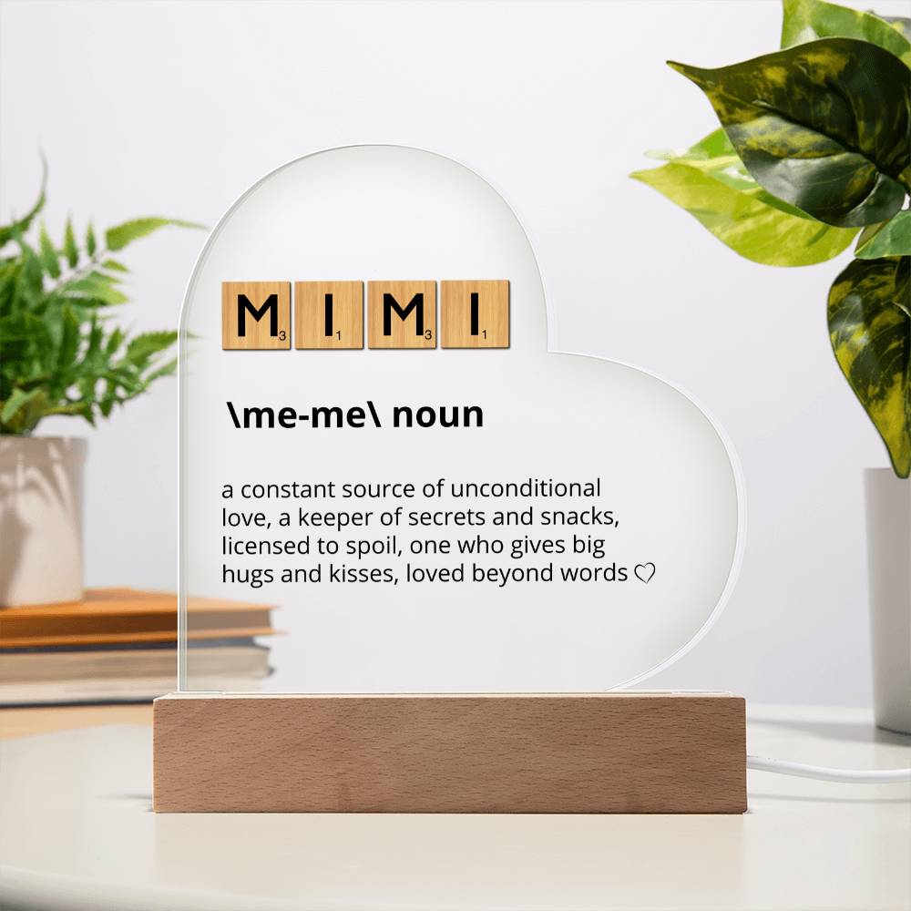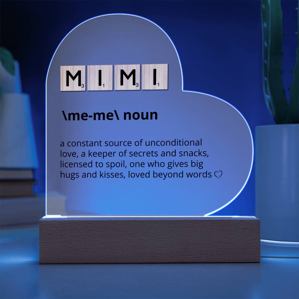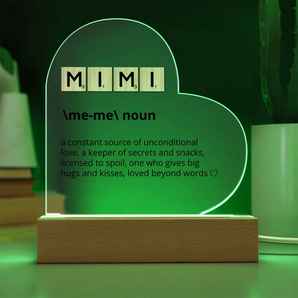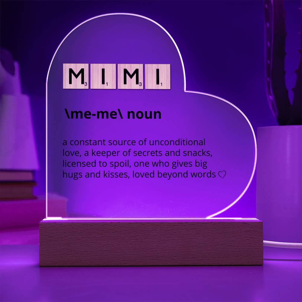 Imprinted with the essence of 'Mimi,' this unique piece, optionally available with LED lighting, transcends a mere plaque – it's a luminous embodiment of the cherished memories and boundless love shared between a grandchild and their Mimi.