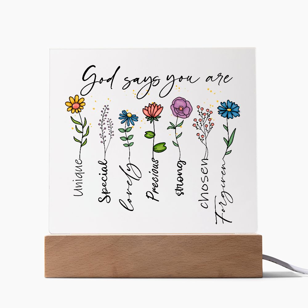 The "God Says You Are" acrylic night light is a beautiful and inspiring piece of wall art that serves as a daily reminder of your worth and value. The plaque features the phrase "God says you are" in bold lettering, followed by a list of positive affirmations such as unique, lovely, and forgiven. The text is printed on a clear acrylic panel that gives it a sleek and modern look, making it a perfect addition to any room in your home or office. Whether you're looking to boost your own self-esteem or give a thoughtful gift to someone special, the God Says You Are acrylic night light is sure to inspire and uplift.