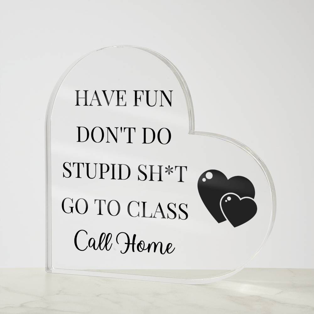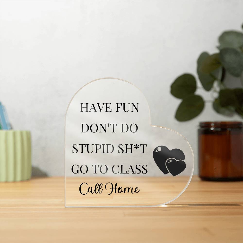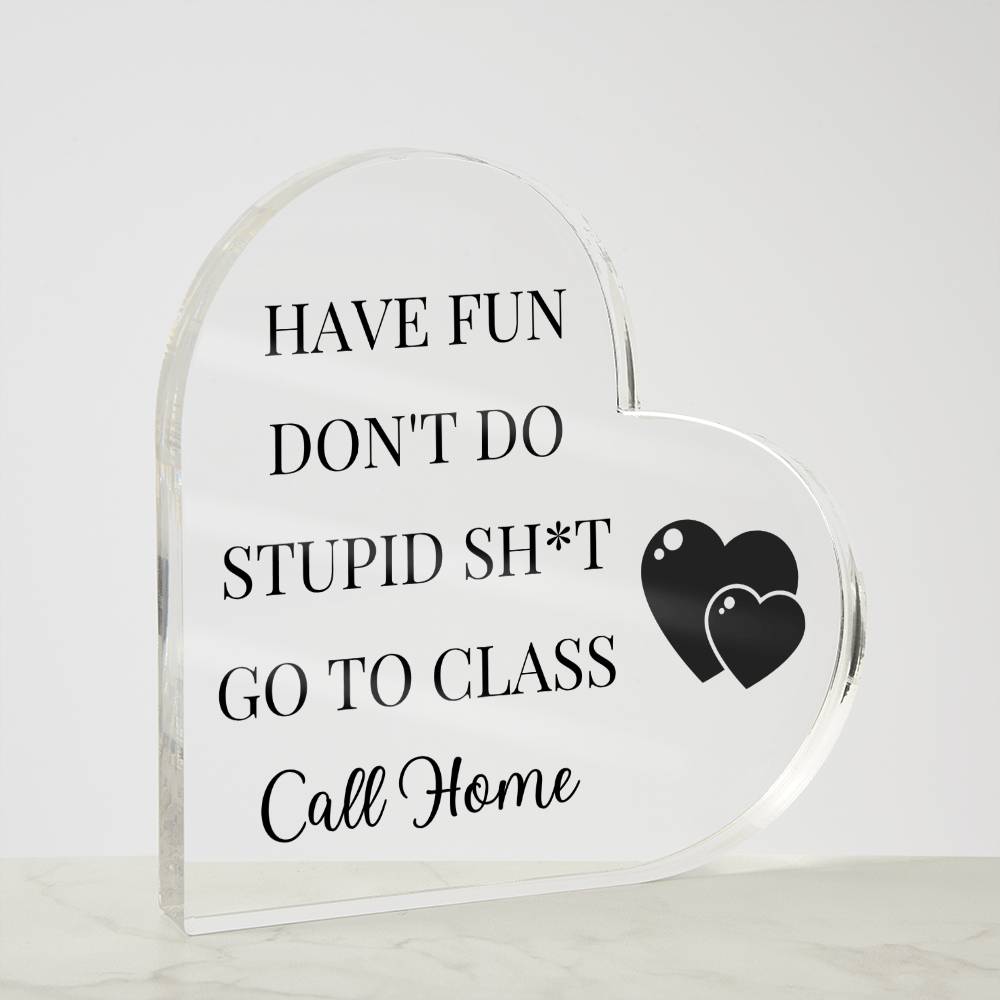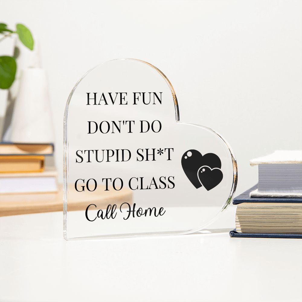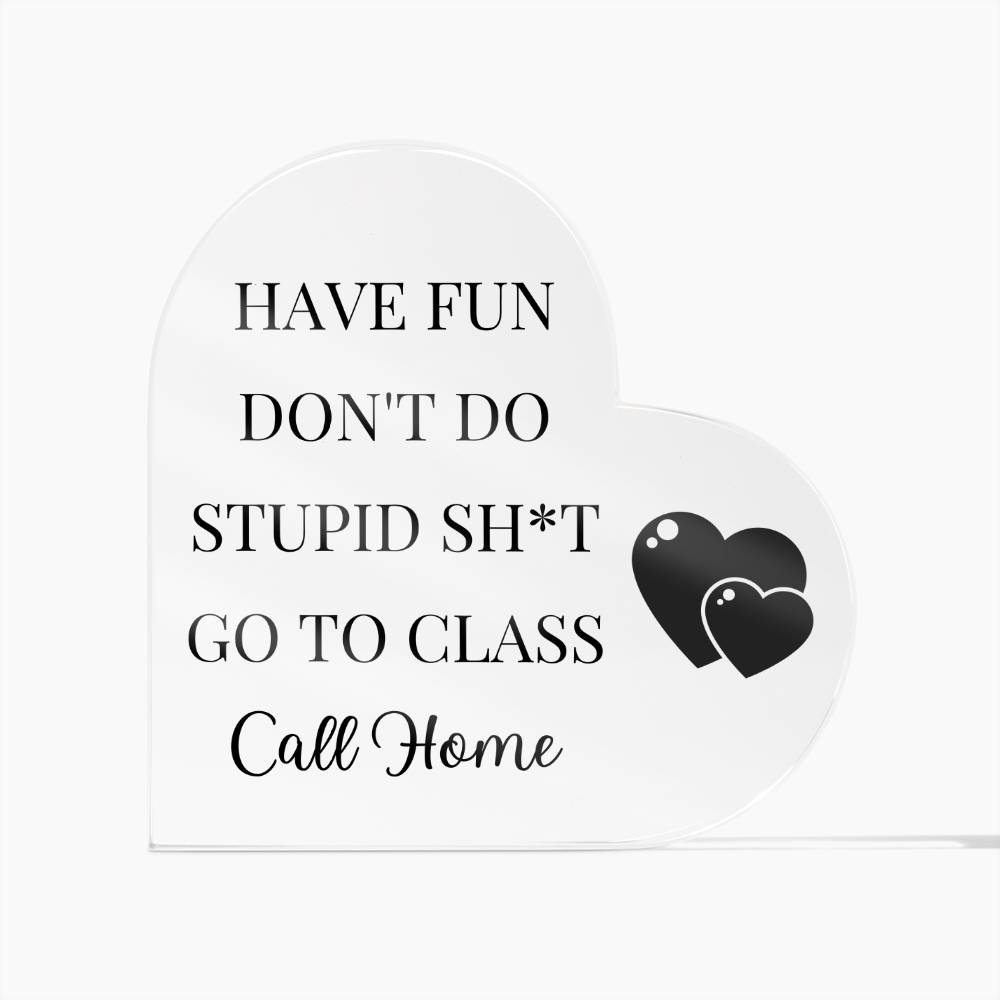 This acrylic heart plaque gift for your college student is sure to put a smile on their face! The plaque is made of high-quality, durable acrylic and features a humorous message that reads "Have Fun, Don't Do Stupid Sh*t, Go To Class, Call Home!" The sleek, modern design of the plaque will complement any dorm room or office decor. Give your student a gift that will make them laugh and feel loved with this funny acrylic heart plaque.