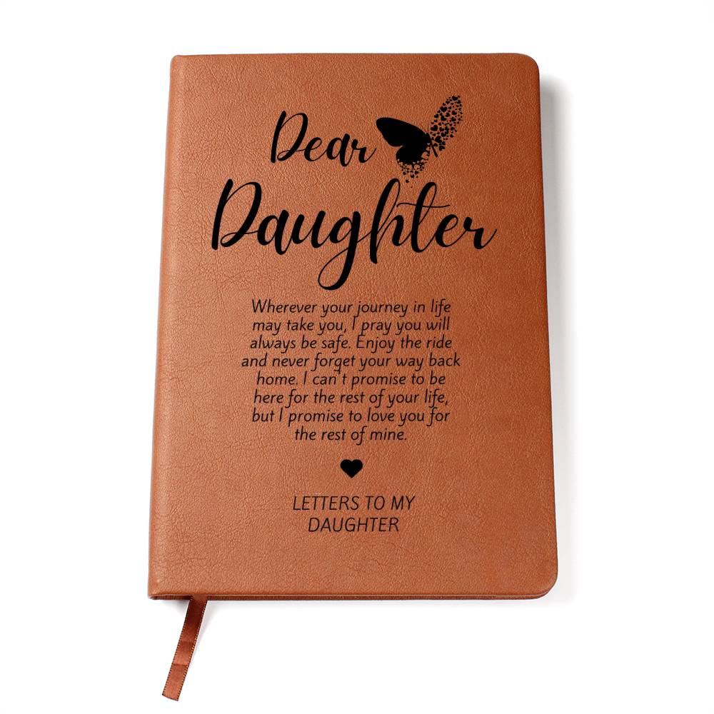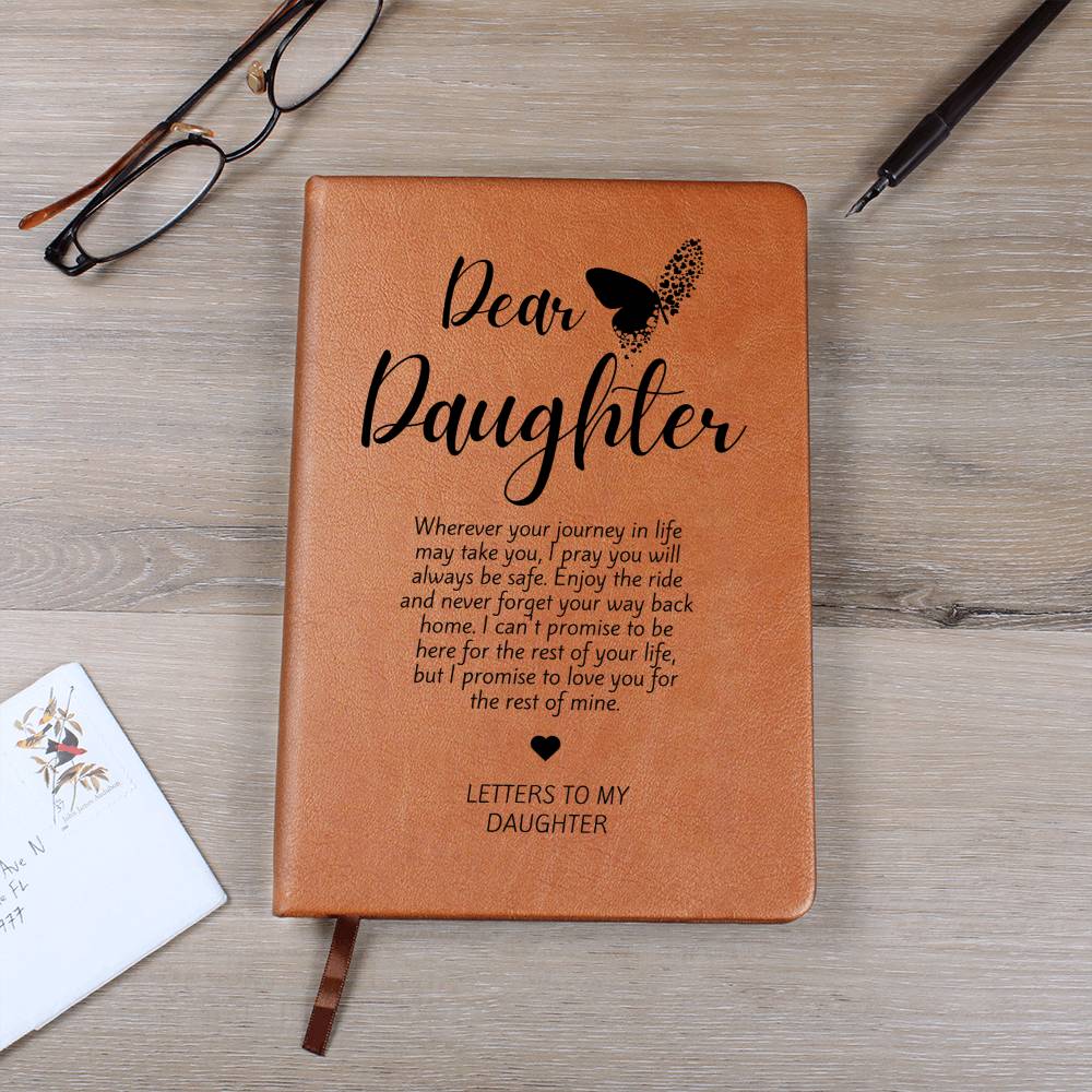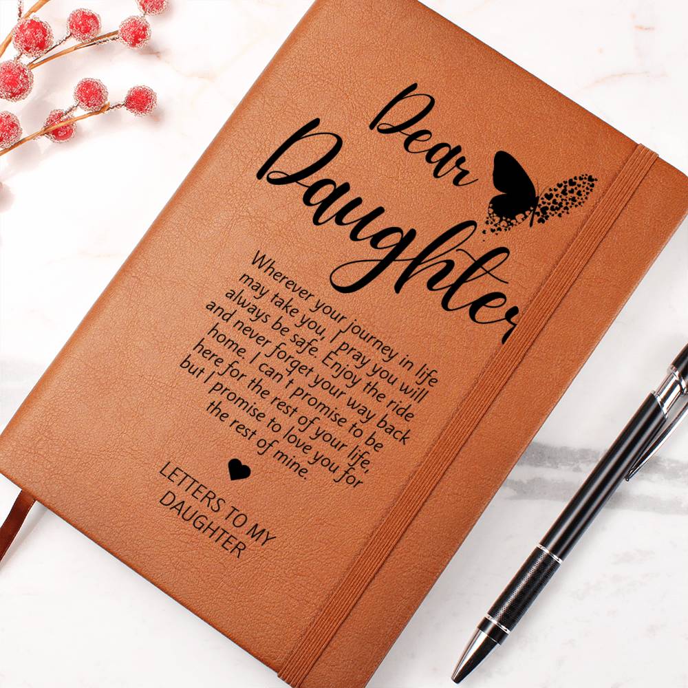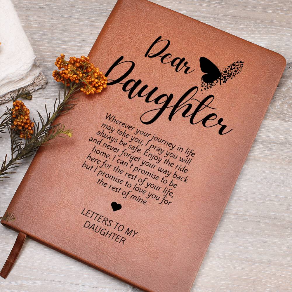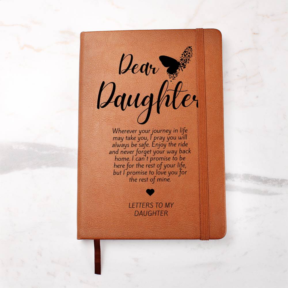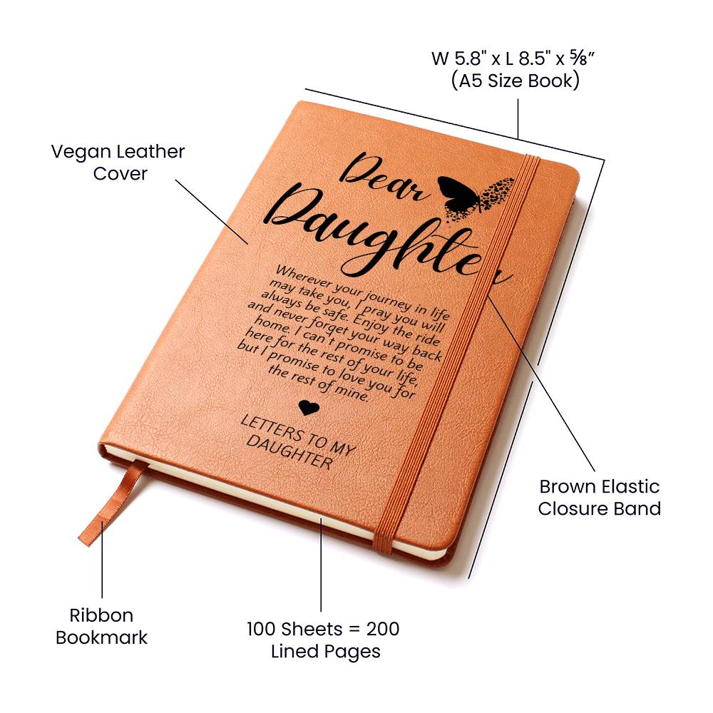Celebrate the remarkable journey of your daughter with our exquisite "Letter to My Daughter" Graphic Leather Journal. This beautifully crafted journal is designed to capture and preserve the heartfelt moments and precious memories shared between a parent and daughter during significant milestones like graduations, birthdays, first year of college, weddings, or as a gift for the arrival of a new baby girl.