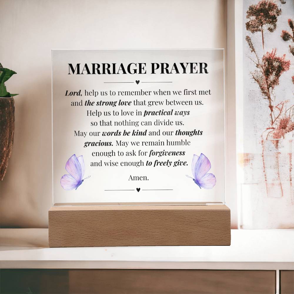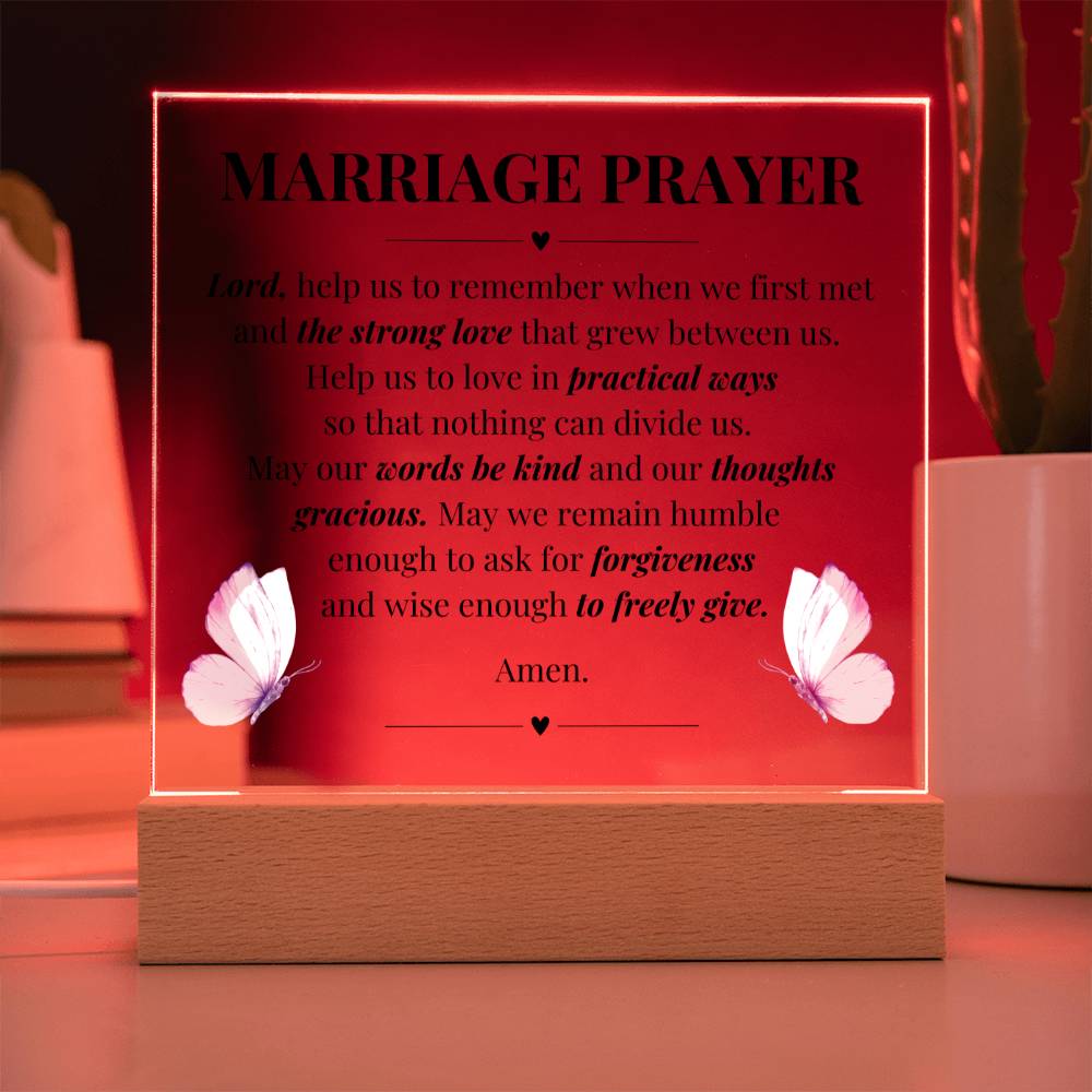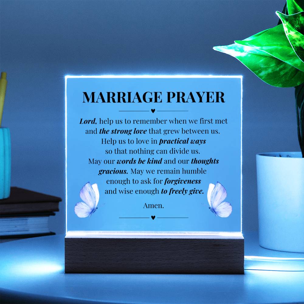 Introducing our profoundly moving "Marriage Prayer" LED acrylic plaque for couples, a luminous prayer for enduring love: "Lord, help us to remember when we first met and the strong love that grew between us. Help us to love in practical ways so that nothing can divide us. May our words be kind and our thoughts gracious. May we remain humble enough to ask for forgiveness and wise enough to freely give."
