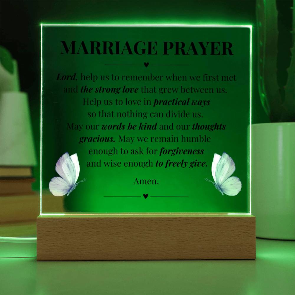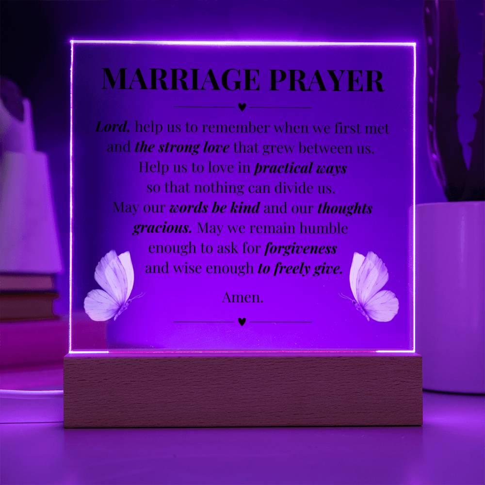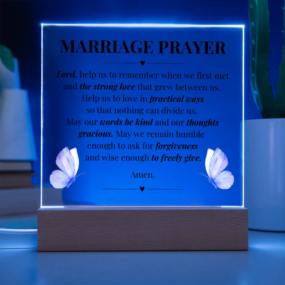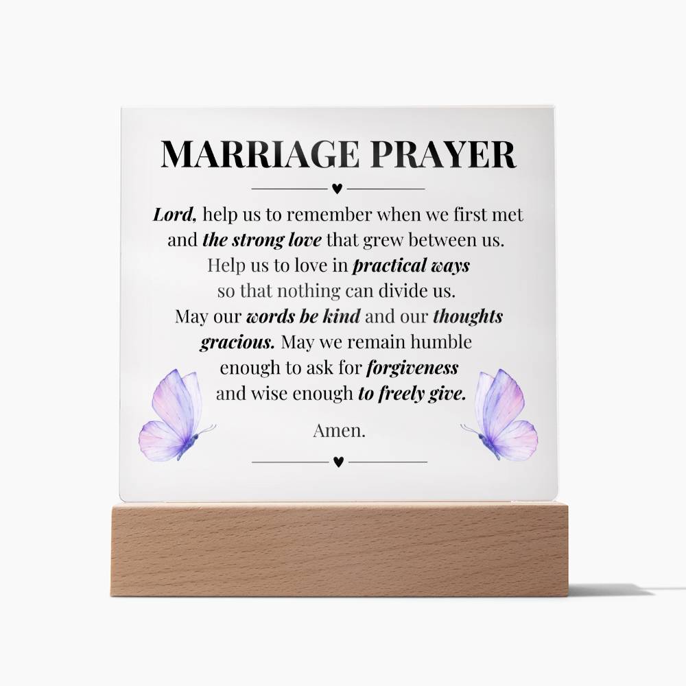 Introducing our profoundly moving "Marriage Prayer" LED acrylic plaque for couples, a luminous prayer for enduring love: "Lord, help us to remember when we first met and the strong love that grew between us. Help us to love in practical ways so that nothing can divide us. May our words be kind and our thoughts gracious. May we remain humble enough to ask for forgiveness and wise enough to freely give."