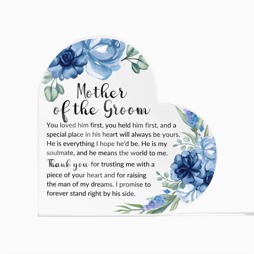 A mother-of-the-groom acrylic heart plaque is a thoughtful and sentimental gift that can be given to the mother of the groom on your wedding day. The plaque is made of high-quality acrylic and features a heart-shaped design with a beautiful message inscribed on it. This gift is perfect for expressing gratitude and affection to the mother of the groom for her love, support, and guidance throughout the years. It serves as a timeless keepsake that can be cherished for years to come.
